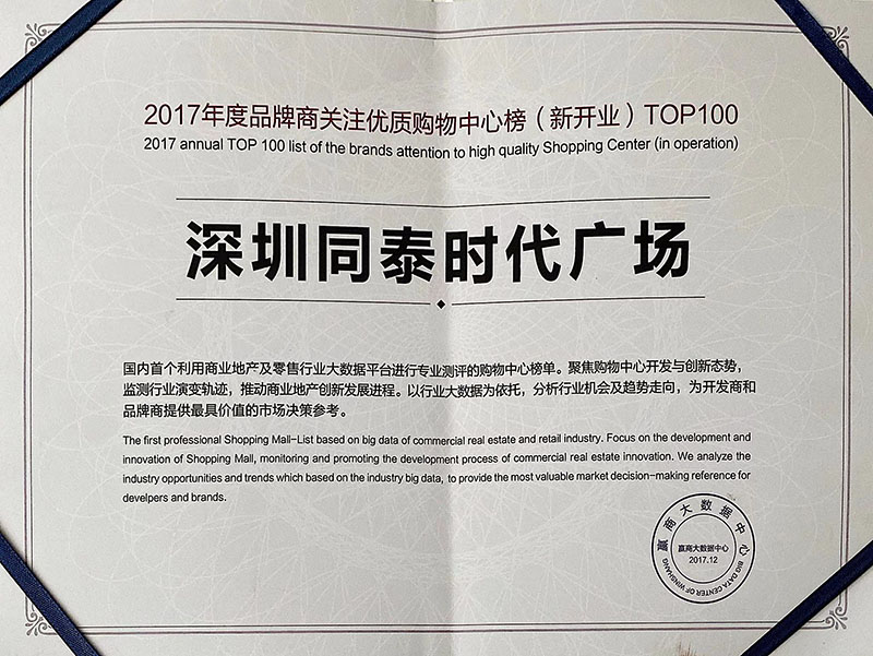 2017年 荣获 赢商网大数据中心 2017年度品牌商关注优质购物中心榜(新开业)TOP100